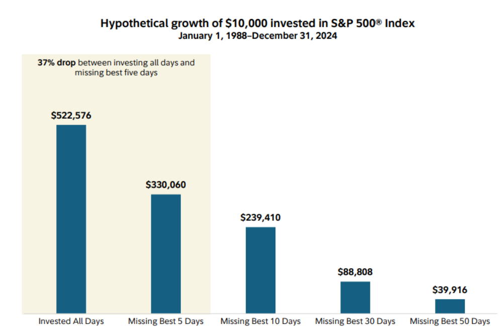 However, missing just the five best market days over that same 37-year period slashes the ending value by roughly 37%.